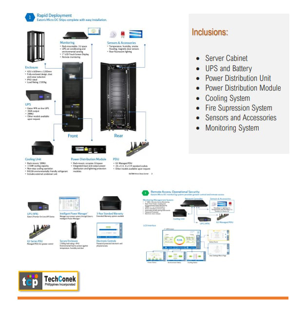 Data Center in a cabinet or Integrated Data Center is the best solution for a client with remote office that requires a fully secured integrated small foot-print of Data Center/Server Rack. This solution is the best fit for research, small branches, construction facility, temporary facility, and similar environment. It comes with all support utilities to ensure 24×7 operation and accessibility to your data.